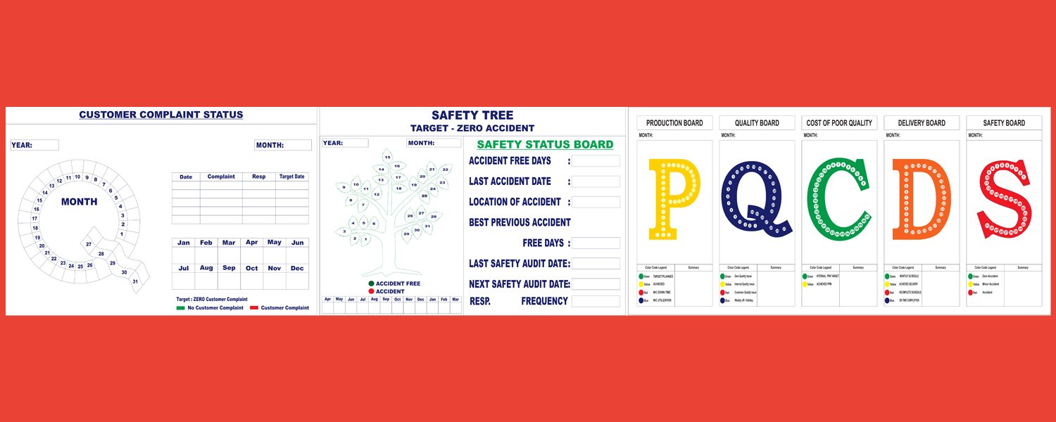 Beyond these, we provide critical tools like 5S, Safety, Quality, TPM, and TQM posters, along with real-time displays for production, safety, and quality status.